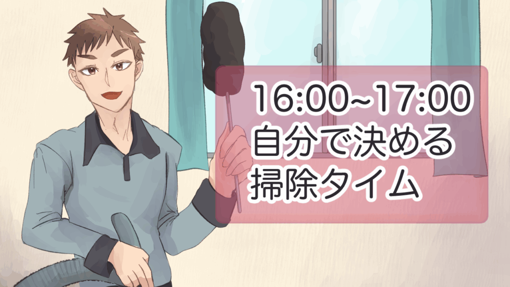 - 「この部屋を掃除する」(はじめに掃除をする部屋を決めると、集中しやすい)