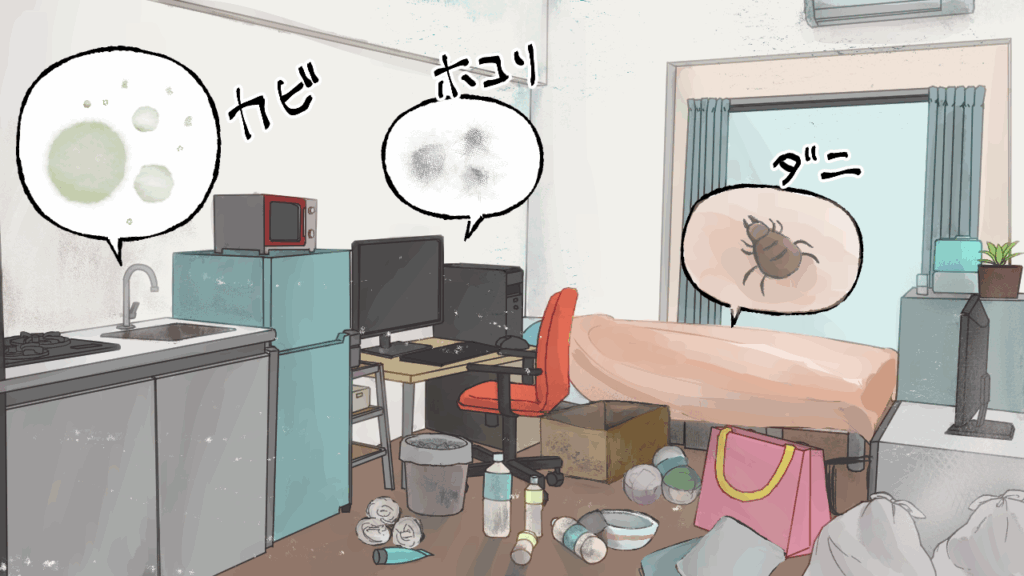 まず、部屋を掃除せずに放置すると、アレルギーにかかりやすくなってしまいます。部屋には目に見えないダニやハウスダストが存在しており、人は知らず知らずのうちにそれを吸っています。そのまま吸い込み続けていると、体が過剰反応し、アレルギー性鼻炎や喘息にかかりやすくなります。