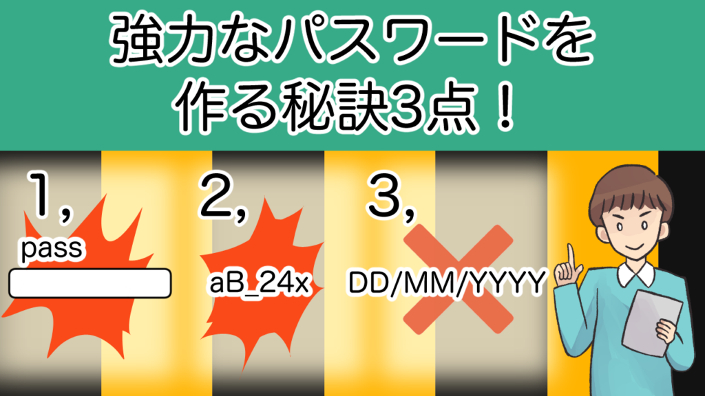 強力なパスワードには、「長く・複雑に・個人情報を介さない」という3つの注意点があります。