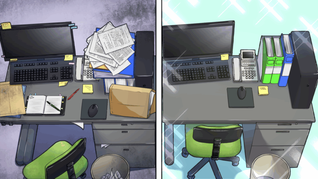 整理整頓されたキレイなデスクは見た目が良いだけでなく、書類を探す手間がなくなるので仕事の効率アップにも繋がります。